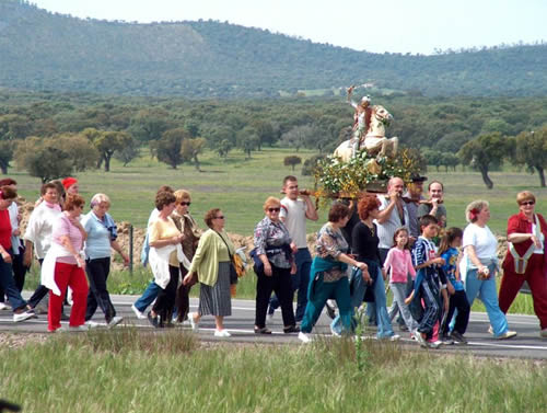 En la mañana del 1 de Mayo se celebra la procesión portando los romeros y romeras la imagen de Santiago a caballo, tanto a la ida como a la vuelta, desde el pueblo hasta la finca reseñada a través de la Nacional 630. En este lugar pasamos un día agradable de campo acompañados por una verbena que ameniza los bailes realizado por las personas del pueblo y alrededores.