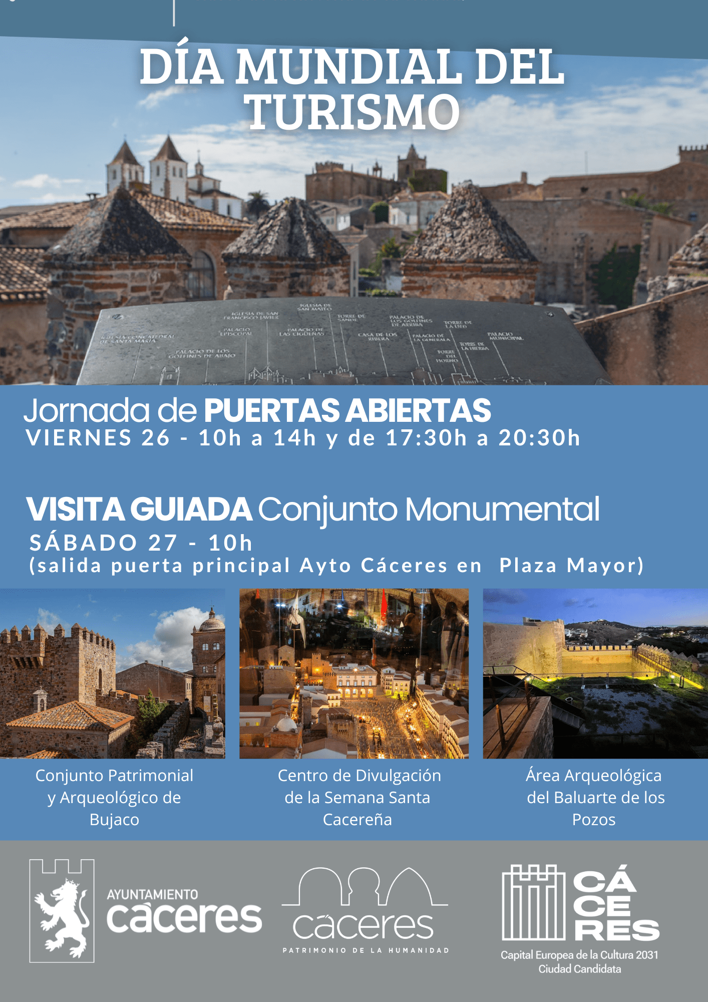 DÍA MUNDIAL DEL TURISMO 25 septiembre 2025 EL 26 DE SEPTIEMBRE SE CELEBRA EL DÍA MUNDIAL DEL TURISMO EL 26 DE SEPTIEMBRE SE CELEBRA EL DÍA MUNDIAL DEL TURISMO Y EL AYUNTAMIENTO DE CÁCERES NOS OFRECE UNA SERIE DE ACTIVIDADES GRATUITAS.
