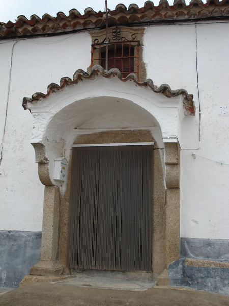 Puerta dintelada enmarcada en arco de medio punto rebajado. Descansa sobre dos cuerpos superpuestos, uno cóncavo y otro convexo, que avanzan juntos, descansando sobre pilares de cantería, adosados a los laterales de la puerta. Su base es cuadrada. El frontal del arco es mixtilíneo moldurado. El material usado es piedra.